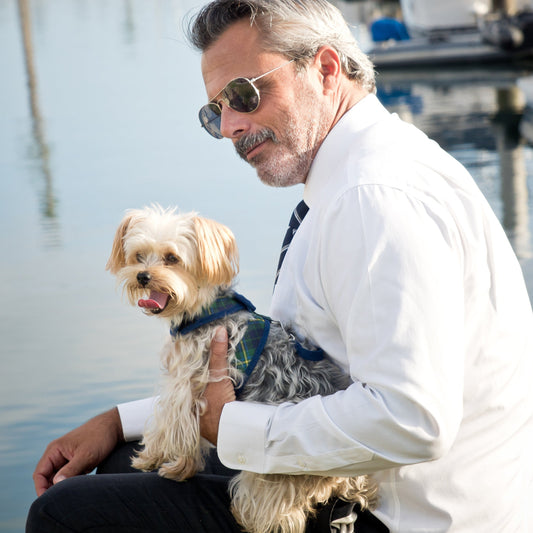 Scotty Plaid Indigo Bow Tie Tinkie Harness with Indigo Trim