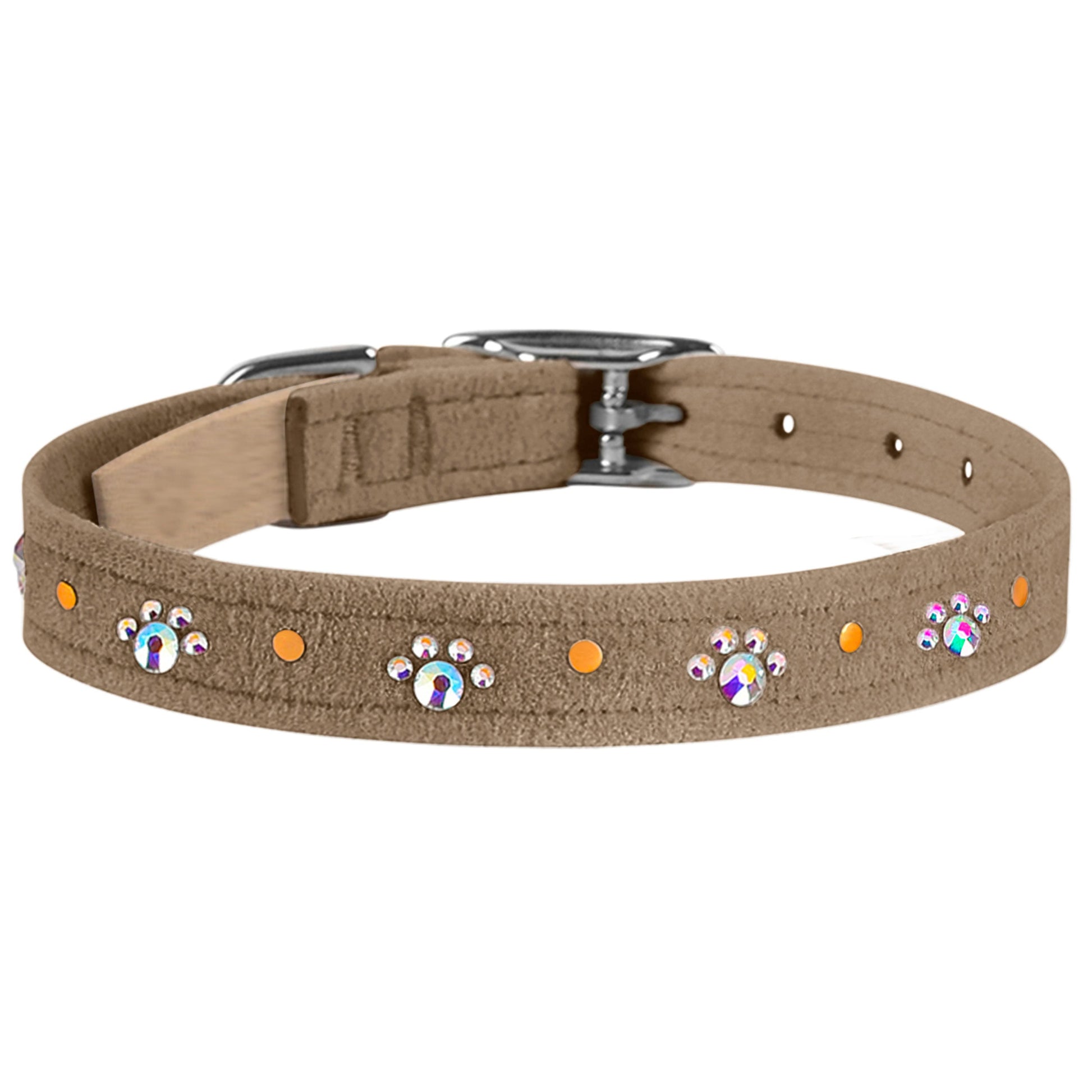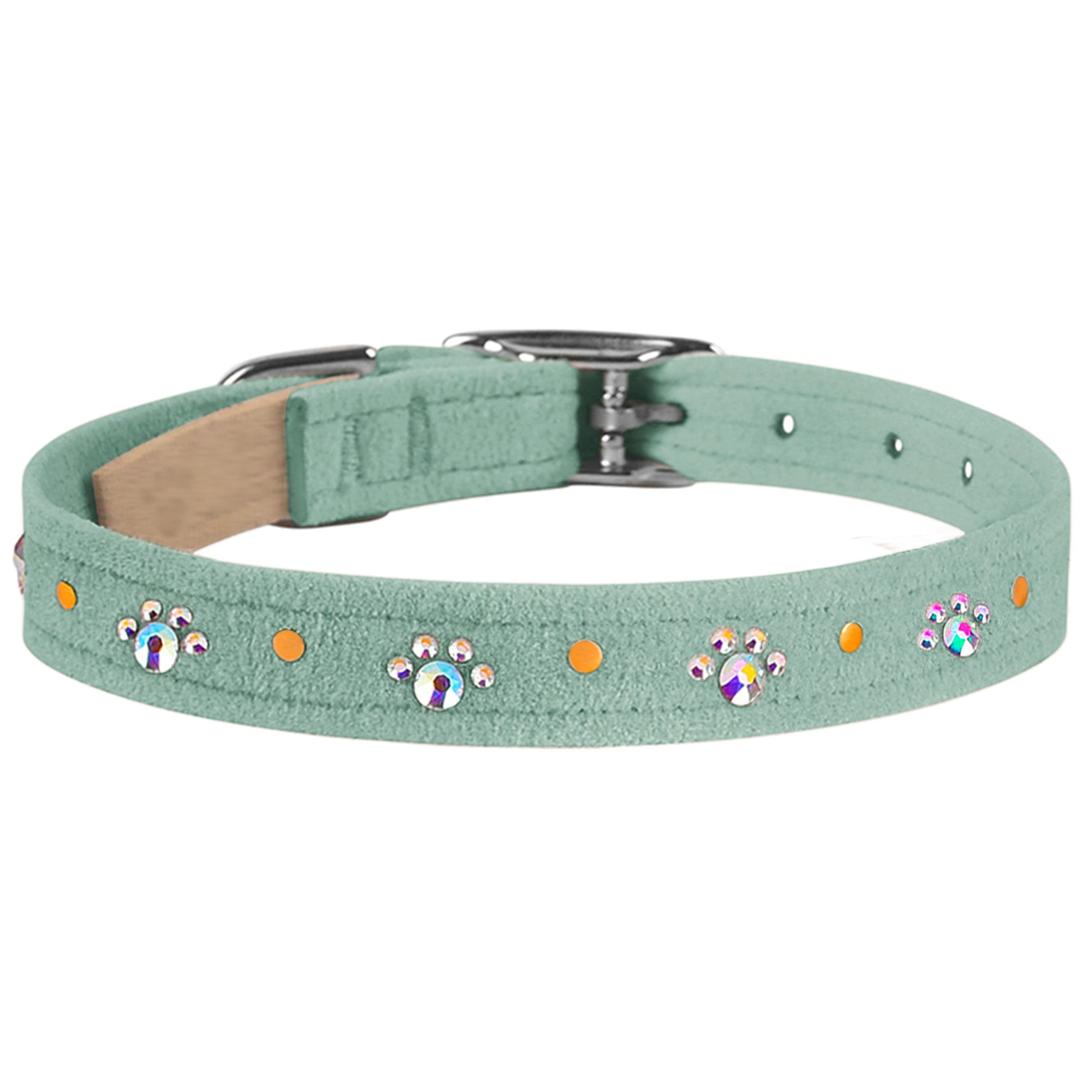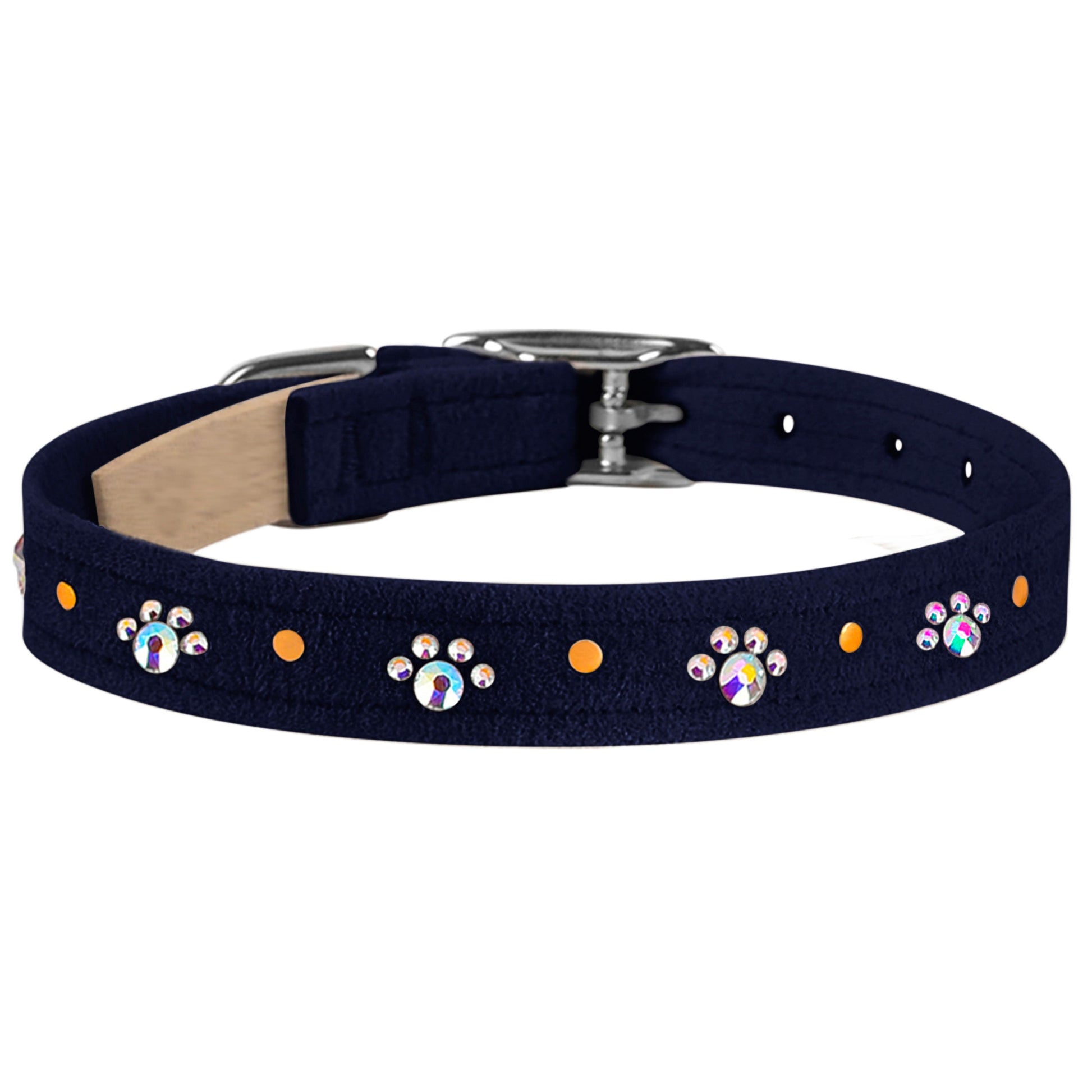 Little paws, Big shine! This Ultrasuede Dog Collar is embraced by Luxurious Crystal Paw Prints. The ideal collar for the playful, yet elegant pup.