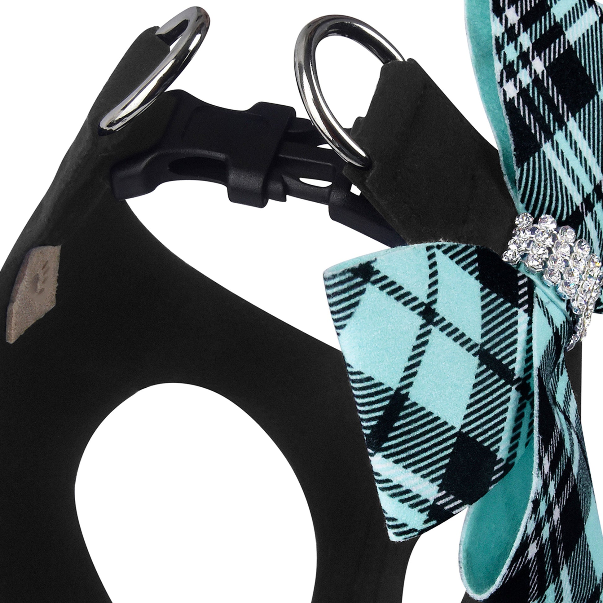 Tiffi Plaid: A vibrant take on the timeless plaid print. This black step in dog harness is topped with a Tiffi Plaid Nouveau Bow centered with Premium Giltmore Crystals to create a fun style staple to brighten your pup's winter wardrobe.