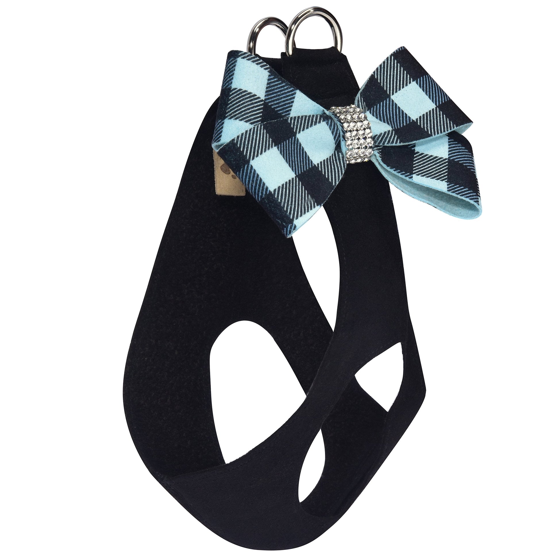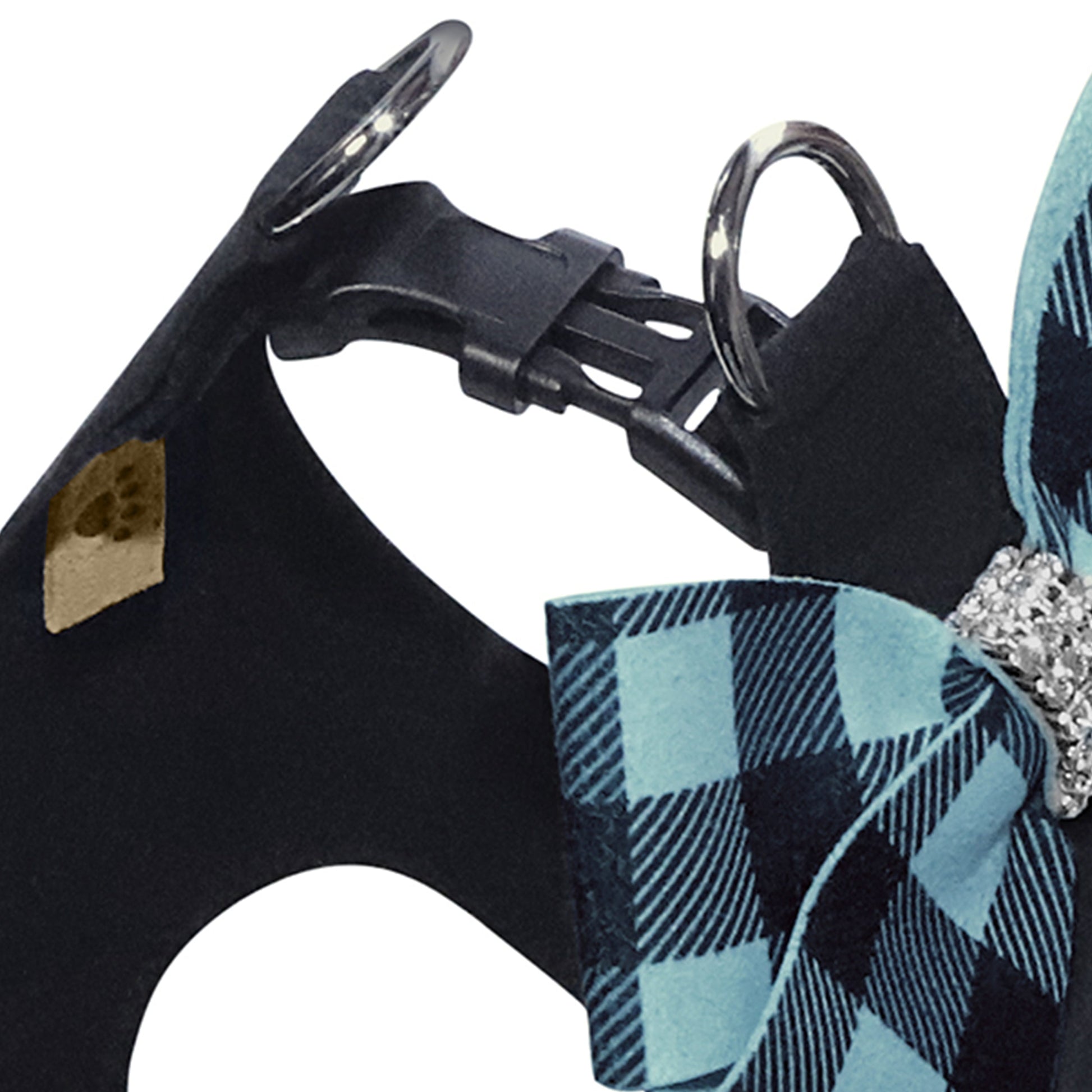 Who doesn't love gingham and bows? This black Step In Harness features an elegant Gingham Nouveau bow topped with rows of gleaming giltmore crystals. The stunning Tiffi blue gingham design against the classy black fabric is sure to turn heads during your dog’s afternoon stroll.